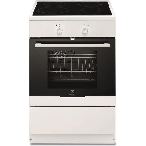 Electrolux induksjonskomfyr i hvit utførelse. Komfyren har induksjonstopp med flere kokesoner og integrert stekeovn med rist og stekebrettnivåer. Fronten har betjeningsknapper og håndtak på ovnsdøren. Nederst er det en praktisk skuff for oppbevaring av utstyr. Egnet for vanlig innendørs bruk på kjøkken der det er behov for komfyr med induksjonstopp og stekeovn i én enhet.