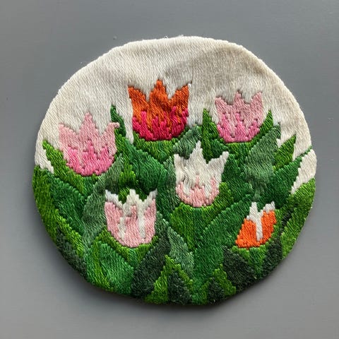 håndbrodert - håndarbeid - broderi - husflid - håndsøm - håndsydd - blå - grønn - gul - hvi - vintage - retro - dekorativ - blomster