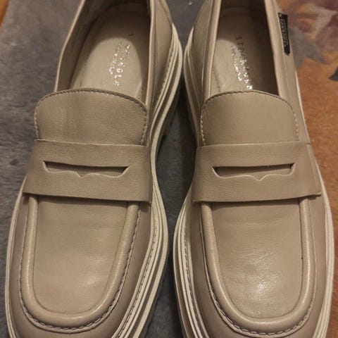 Stockholm Design Group loafers sko i størrelse 39. Skoene er i svart, glansfullt lær med kraftig, profilert såle. Overdelen har en dekorativ metallrem over vristen. Modellen er en klassisk loafer med chunky såle som gir godt grep. Passer til hverdagsbruk og penere anledninger.