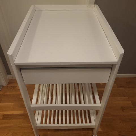 Lukas stellebord. Stellebordet har en toppflate til stell av baby, én skuff under stelleflaten og to åpne hyller. Leander stellematte passer fint oppi.