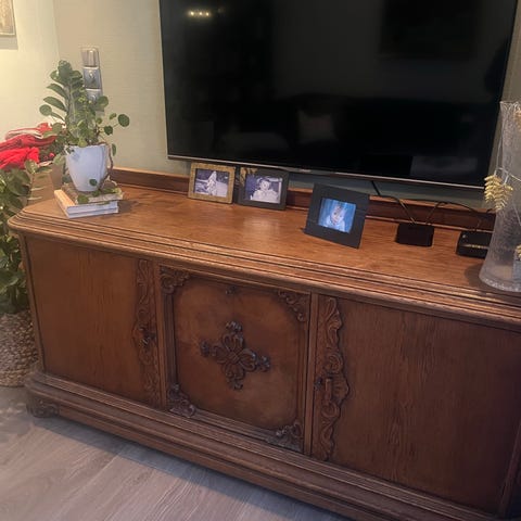 Skjenk i tre. Skapet har to dører og står på korte ben. Fronten har utskårne detaljer i hjørnene og langs midtpartiet. Overflaten fremstår som beiset eller lakkert treverk i en mørk tone. Skapet kan brukes til oppbevaring i stue, gang eller andre rom der det er behov for lukket lagringsplass og en møbeloverflate til dekor eller gjenstander på toppen.