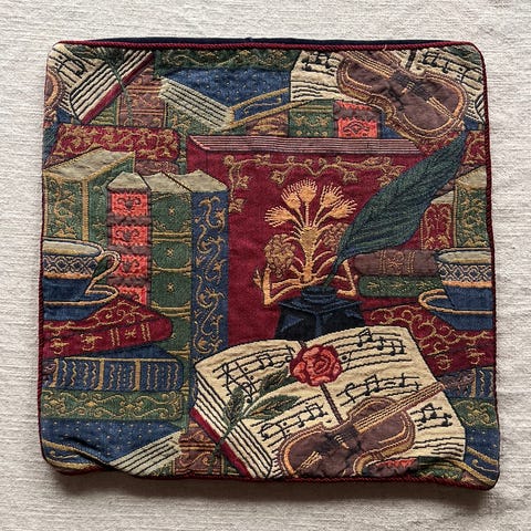 Flott putetrekk i gobelinaktig-stoff med rikt og detaljert motiv av bøker, noter, fiolin, fjærpenn og kopp. Baksiden er i dyp burgunder fløyelsaktig stoff. Perfekt til sofa, lesekrok eller hytte. Se bilder for mål. 🥀