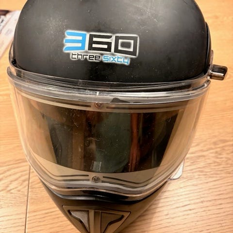 Tøff Hjelm med avtagbart munnstykke. Så det blir halvjelm.Følger med et ekstra visir som er litt sotet/ Mørkere en det blanke som står på