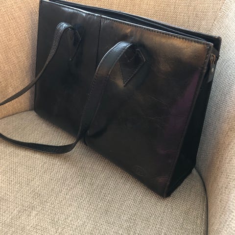 veske i skinn for unisex. Vesken er i svart glatt skinn med to bærehåndtak. Den har glidelåslukking på toppen og et rutete fôr på innsiden. Innvendig er det flere rom og lommer som kan brukes til oppbevaring av mindre gjenstander. Egner seg til daglig bruk, jobb eller studier, og har plass til dokumenter og en mindre bærbar PC