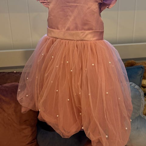 Kjolen har flotte detaljer med glitter, sløyfer, tyll og dekor foran. Den er komfortabel å ha på og veldig fin i fasongen.
