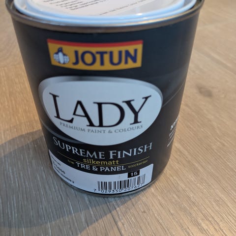 Selger et nesten fullt spann Jotun Lady Supreme Finish 0,68 liter i fargen 7628 Treasure (fargekode NCS 3508-G36Y). Glansgrad 03 pure matt på denne.