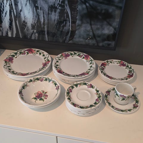 Vivaldi Figgjo Norway 3st. tallerkener i porselen med flerfarget blomstermønster langs kanten. Tallerkenen har klassisk rund form og glatt, hvit midtflate som gir god plass til servering. Dekoren består av slyngende grønne ranker med rosa og lilla blomster. Egnet til bruk som middagstallerken eller serveringstallerken i hverdagen eller til selskap. Kan kombineres med annet servise i lignende farger og stil. Noen spor av bestikk. 100 pr st. 250 - 3st.