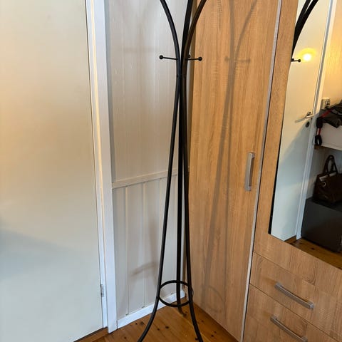 IKEA stumtjener i svart metall. Frittstående modell med rund, stabil fot og flere flyttbar armer i ulike høyder for oppheng av jakker, kåper, vesker og tilbehør. Egner seg for bruk i entré, gang, soverom eller kontor for organisering av klær og yttertøy.