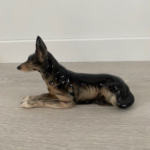 Klassisk schæfer i sittende positur med fine detaljer og vakker glasur. Eldre produksjon med naturlig patina og alderspreg.