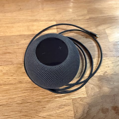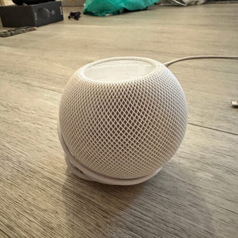 Apple HomePod mini høyttaler i hvit farge. Kompakt, rund bordhøyttaler med integrert strømledning og separat strømadapter med USB‑C til vegglader. Støtter trådløs avspilling via Apple-økosystemet og kan brukes til musikk, podkaster, taleassistent og styring av kompatible smarthjem-enheter.