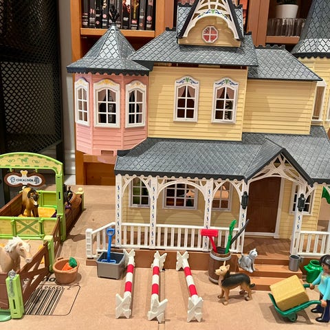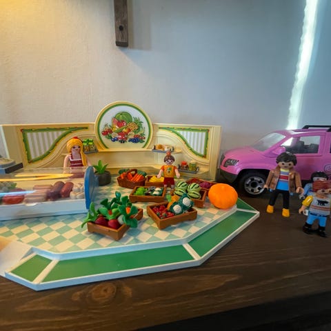 Veterinær, legekontor, sheriffskontor, dinosaurbåt og lekeplass. Mye tilbehør og flere mennesker og dyr. Ingen av settene er komplett, men kan fint lekes med på tvers av hverandre. Sheriffskontoret har en liten skade(se bilde) men hindrer ikke leken.