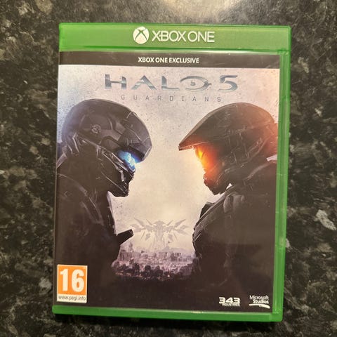 Halo 5 Guardians Xbox One spill på fysisk disk. Spillet er utviklet for Xbox One-plattformen og leveres som standard spillplate uten ekstra tilbehør. Egnet for én spiller og flerspiller, både lokalt og online, avhengig av konsollens funksjoner og eventuelle abonnementstjenester. Aldersmerking PEGI 16 ifølge trykk på disken.