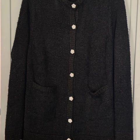Helt ny, lekker Zhenzi jakke, farge sort. Strikket med en liten tynn sølvtråd. Lekre blomster knapper med perler . Lengde 73 cm. To lommer. Lett flyffy innside. Fin til hverdags og fest! Den virker myk og lun. Str 58 Xxl ( stor i str, vil si 3-4 XL) ble altfor stor for meg… kjøpt uten å prøve. Ny pris 999,- ( alle lapper sitter på) Selges med -70%. Kun kr 299,-