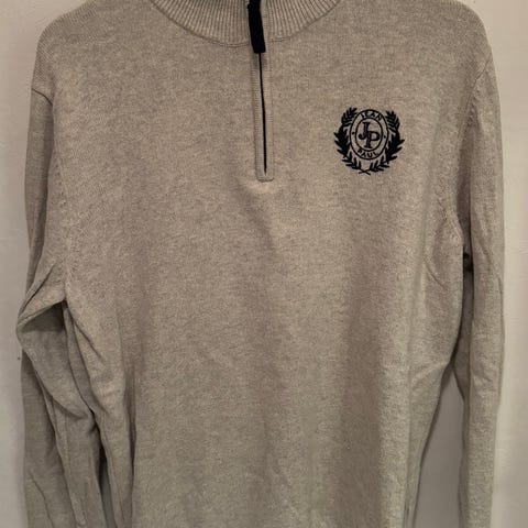 Amundsen genser for herre i størrelse M. Genseren er grå og laget av 100 % merinoull. Den har høy hals med glidelås og ribbestrikkede kanter nederst og på ermene. På ermet er det flere påsydde merker med Amundsen-tema. Passer til hverdagsbruk og som mellomlag på kjølige dager.