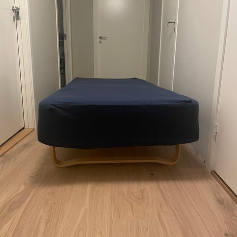 IKEA seng i grått tekstiltrekk. Sengen har rette, enkle linjer og står på runde metallben. Liggeflaten bæres av en treribbe-bunn. Passer som enkeltseng på soverom, gjesterom eller hybel.
