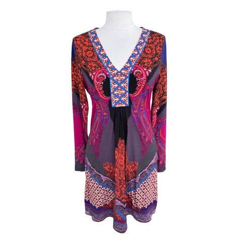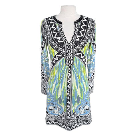 Lekker langermet kjole fra Hale Bob. Nydelig utringning dekorert med brune og sorte stener. Pent mønster i sort, brunt og hvitt. Feminin og innsvinget passform, og god stretch i stoffet. Kjolen er foret og veldig pen. Super i kofferten da den ikke krøller. Den leveres skånsomt vasket og klar til bruk.