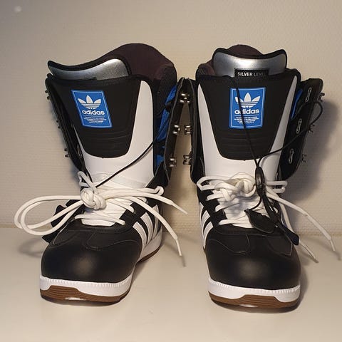 Adidas Silver Level snowboardstøvler i svart og hvit. Støvlene har tradisjonell snøring foran og høy skaftkonstruksjon for støtte rundt ankel og legg. Yttermaterialet er syntetisk med gummisåle. Passer til bruk på snowboard i bakke og park. Størrelsesinformasjon står på etiketten i skaftet (se bilde for detaljer).