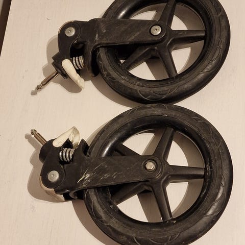 Baby Jogger barnevognhjul. To komplette hjul med dekk og felg, egnet som reservedeler til kompatible Baby Jogger-barnevogner. Passer i alle fall City GT og de kan brukes på Elite, men er mindre enn de originale. Hjulene har skumfylye dekk og plastfelger med flere eiker. Passer som erstatning der samme type hjul er brukt fra før, for eksempel ved slitasje eller behov for ekstra hjulsett.