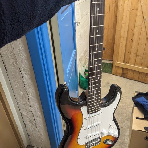 Gitaren er pent brukt og fungerer som den skal. Perfekt for nybegynnere, ungdom eller som øvingsgitar hjemme. Forsterkeren har overdrive og hodetelefonutgang – super til øving uten å forstyrre naboene 😊