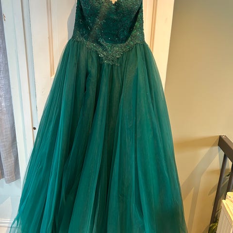 LKW of Norway kjole til spesiell anledning i størrelse XS for dame. Kjolen er laget i tyll og har grønn farge. Overdelen har dekorative blonder og snøring i ryggen, og skjørtet er langt og vidt med flere lag tyll. Passer til formelle anledninger som ball, bryllup eller andre høytidelige sammenkomster.