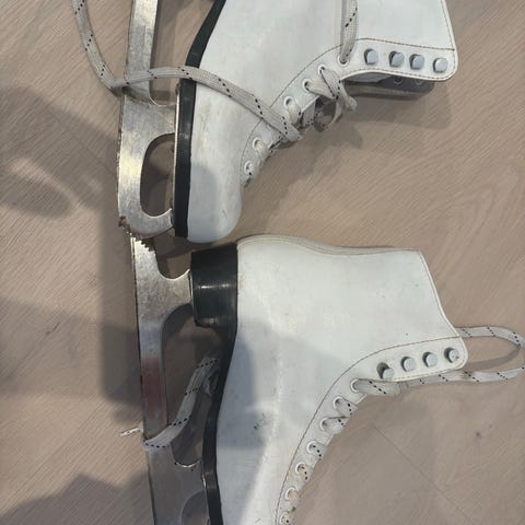 De har ligget en stund på loftet, og var tydeligvis litt fuktige da de har litt rust på metallet. Kan lett børstes av. Godt brukt og prisen reflekterer det