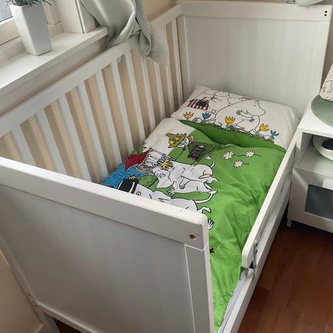 Godt brukt seng gis bort. Den fungerer utmerket, men har noen bruksmerker. Det er sprekk i rekkverket ved hodeenden. Senga har en fint uttrekkbart skrivebord. Vi har montert på en knaggrekke, den følger med senga. Madrass og overmadrass kan også følge med.