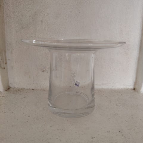 Hadeland Glassverk tulipanvase i klart glass. Lysestaken har sylinderformet fot og bred, flat topp med fordypning til blomster. Egnet til bruk som borddekorasjon eller på vinduskarm. Klassisk design i transparent glass som passer inn i ulike interiørstiler. Designet av Finn Schjøll og Maud Gj. Bugge. 19cm i høyden, og 15cm i bredden.
