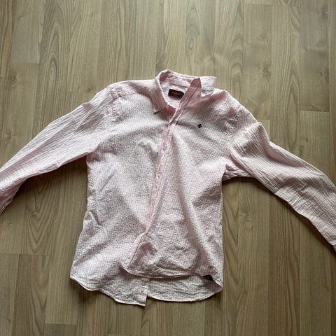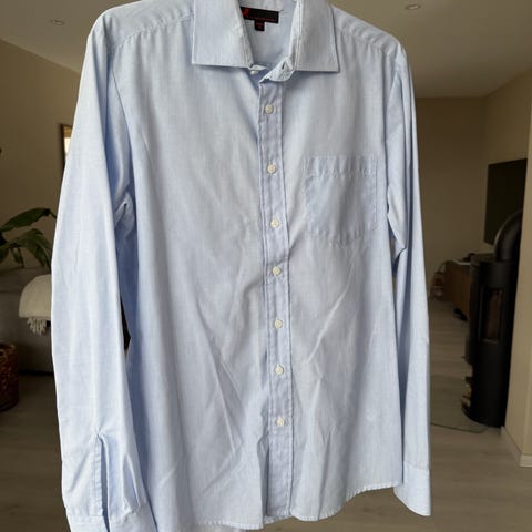 Klassisk blå og hvitstripet skjorte fra Morris. Str M. 100 % bomull.