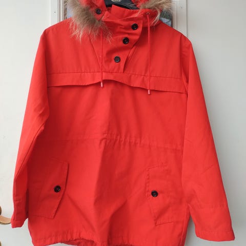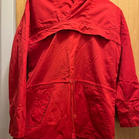 Tradisjonell, vintage rød fjellanorakk, unisex, str. 50 m/ avtagbar, ekte pels på hetten. Ajak. Har brystlomme med glidelås og lomme foran med knapper. I tillegg stropp til å ha mellom bena, så anorakken ikke «blåser opp.»