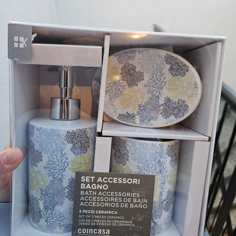 Baderomssett såpedispenser, kopp og såpeskål flerfarget