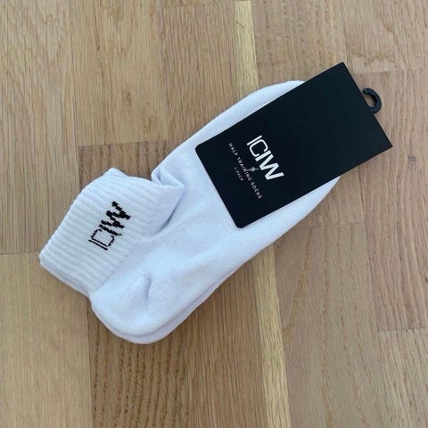 Materiale ifølge lappen: polyester, nylon og elastan (blanding). Sokkene er lave/ankelhøye med ribbestrikket kant og forsterkede soner. Passer til bruk i joggesko, treningssko eller andre fritidssko for både kvinner og menn i størrelse M. 300kr begges