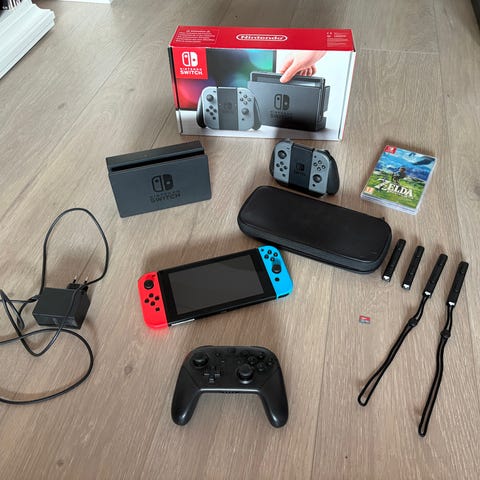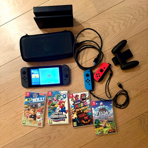 Inkluderer dokkingstasjon, 2stk stropper til Joy con kontrollene, lader, hdmi kabel, uåpnet sportutstyr sett (10deler) og to spill: