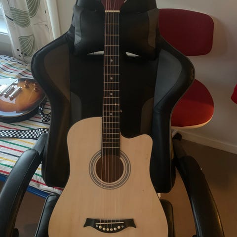 Akustisk gitar i standard full størrelse. Kroppen har naturfarget topp og mørk bakside og sider. Gitaren har seks strenger, metallmekanikker og gripebrett i mørkt treverk eller trelignende materiale. Egner seg til generell bruk, øving og akkompagnement for både nybegynnere og mer erfarne gitarister. Mangler liten lakk på side. Se bildet. Ellers fin. Byttet noe strenger.