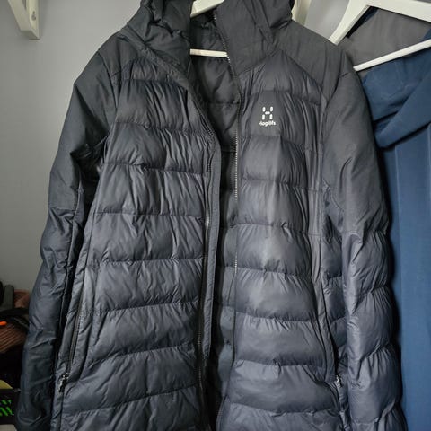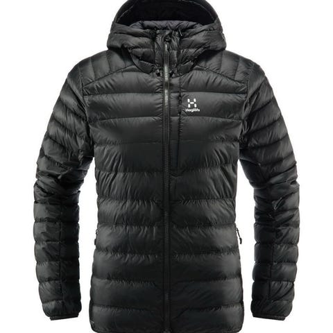 Haglöfs dun vinterjakke for dame i størrelse XL. Jakken er svart og fylt med dun for varmeisolasjon. Den har hette, gjennomgående glidelås i front og vatterte, horisontale sømmer. Ytterstoffet er glatt og lett, med elastiske partier i sidene for bedre passform og bevegelighet. Egnet som ytterjakke i kaldt vær eller som isolasjonslag under skalljakke.Hagløfs Roc down