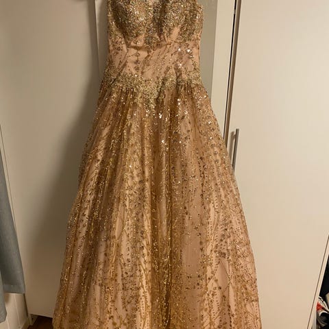 Kjole til spesiell anledning i beige tyll, one size. Kjolen har langt skjørt i flere lag med tyll og overdel med dekorative mønstre. Den har tynne stropper og snøring i ryggen for justering av passform. Egnet til bruk ved formelle anledninger som fest eller andre spesielle begivenheter. Den er brukt bare en gang.