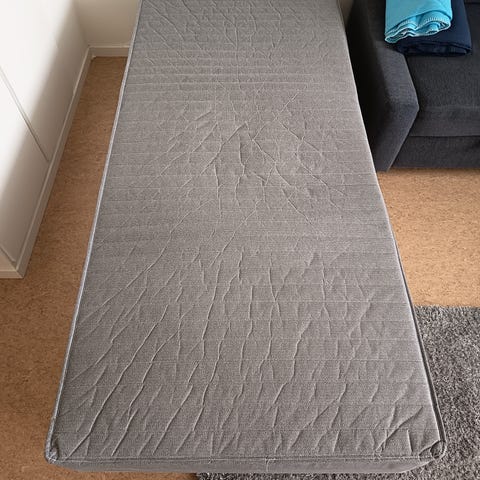 Seng fra IKEA selges billig mot henting i tredje etasje uten heis. Veier lite og er lett å transportere. Undermadrass kan medfølge uten ekstra kostnad hvis ønskelig, denne er også fra IKEA. Undermadrassen har en rift på undersiden, men det har ingen effekt på madrassens funksjon.