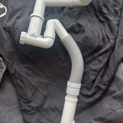 Kjøkkenvask med to kummer og integrert avrenningsfelt i rustfritt stål. Vasken har en stor og en mindre kum med avløp i begge. Det følger med blandebatteri/kran montert på vasken, samt avløpsrør og tilkoblinger som vist på bildene. Egnet for innfelling i benkeplate på kjøkken eller vaskerom.