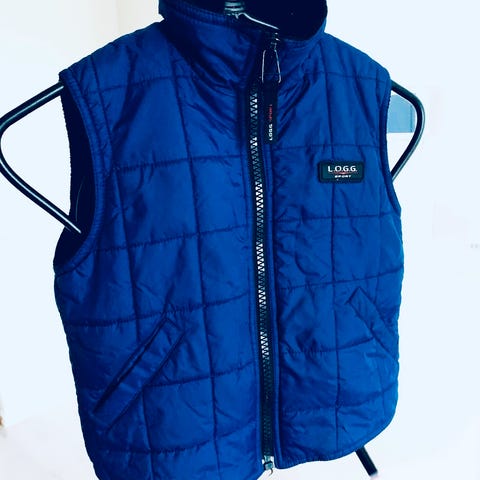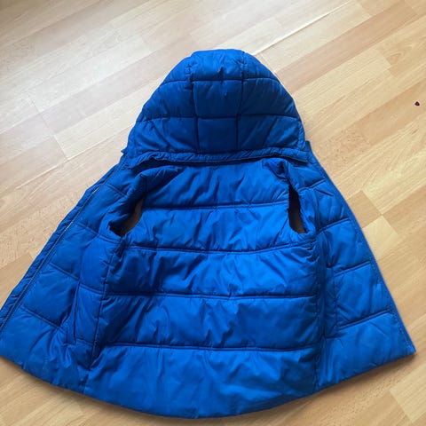 dunvest for gutt i størrelse 116. Vesten er blå og fylt med dun, noe som gir god isolasjon og varme. Den har høy krage og lukkes med glidelås og trykknapper foran. På utsiden er det glidelåslommer. Passer godt som et ekstra lag over genser eller jakke i kjølige perioder.