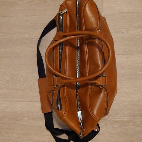 Vintage pensjonert håndbagasjeveske i skinn. Den har to lommer foran. Glidelåsen fungerer som den skal. Det er ett hovedrom og en liten lomme med en skade. Håndtakene på toppen er noe slitt, som vist på bildene.
