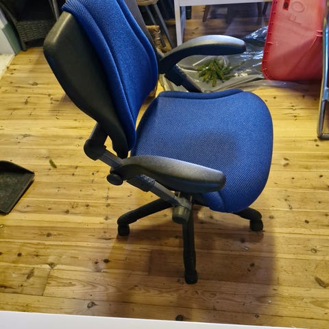 Stolen er pent brukt og i god stand, uten skader som påvirker funksjonen. Justerbar høyde og svingfunksjon gjør den enkel å tilpasse etter behov.