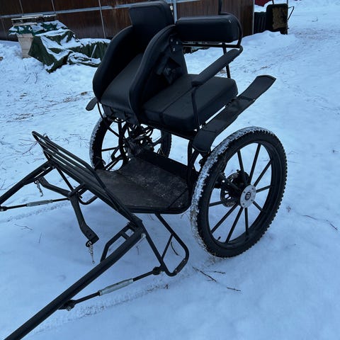 Vogn med svingel brukt på liten fjording (137cm) og nordlandshest selges. Mener sporvidde er 125cm, men kan kontrollmåle på forespørsel. Lett vogn som triller lett. Stått ute i vinter, så trenger sikkert litt TLC. Kosmetiske skader på seteryggen, men ikke noe å si for bruken. Ikke brems.
