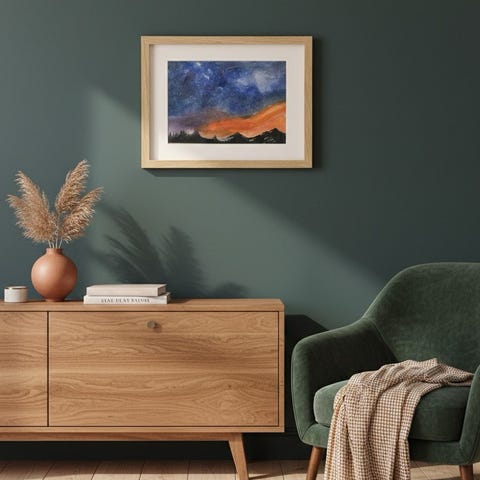 Maleriet selges komplett med en lys eikeramme og hvit passepartout, så det er klart til å henges rett på veggen. Passer perfekt inn i et moderne eller skandinavisk hjem!