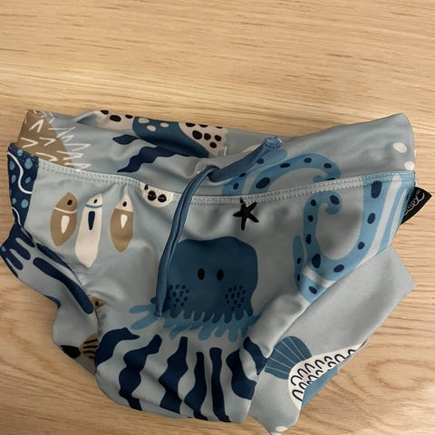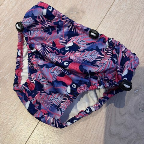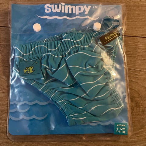 Ubrukt Swimpy badebleie i størrelse Large, egnet for barn 12–18 måneder og eller vekt 10–13 kg selges. Badebleien er rød og kommer i trusefasong. Den er beregnet til bruk i basseng og ved bading for å redusere risiko for lekkasje. Bleien er gjenbrukbar og kan vaskes etter bruk i henhold til vaskeanvisning på emballasjen.