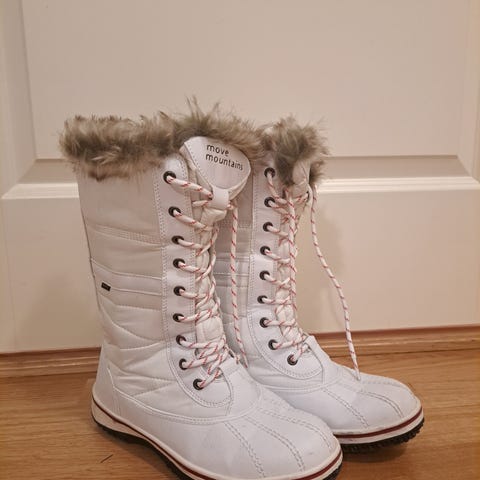 Move Mountains vinterstøvler i størrelse 36. Modellen er ankelhøy med kraftig yttersåle med grovt mønster for godt grep. Overdelen er i lilla og svart syntetisk materiale med tekstilpartier og forsterkninger rundt hæl og tå. Støvlene har snøring med metallhemper og polstret kant rundt ankelen for økt komfort. Egnet som vinterfottøy til hverdagsbruk og tur i kaldt vær.