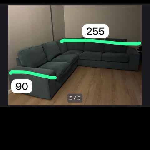 IKEA hjørnesofa i grønn tekstil. Sofaen har god sitteplass med flere sete- og ryggputer. Passer til stue eller TV-rom der det er behov for en romslig sittegruppe.