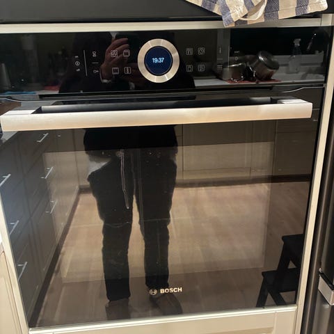 Bosch stekeovn for innbygging i kjøkkenmodul. Front i svart glass med horisontalt håndtak i metall. Elektronisk betjening med display og dreiehjul på fronten. Ovnen er beregnet for integrering i høyskap eller underskap, og bildene viser målskisse med høyde og dybde for nisje og front. Passer som standard 60 cm innbyggingsovn. Egnet til vanlig matlaging og baking i kjøkken der man ønsker en integrert løsning. Stekker ujevnt.