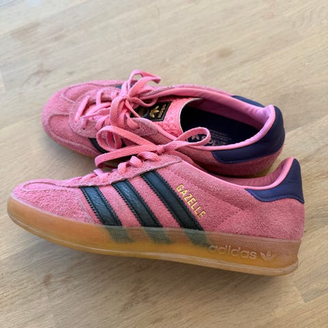 Sel eit par Adidas Gazelle sneakers i lyseblå str 37 1/3. Utruleg fin farge som er vanskeleg å oppdrive i norske butikkar. Brukt som dansesko i bryllaup, har nokre svarte merker på sålen (har ikkje gått til store anstrengelsar for å prøve å fjerne desse), ellers framstår dei som heilt nye. Selgast då dei er hakket for små til meg. Snører i ulike fargar følgjer med