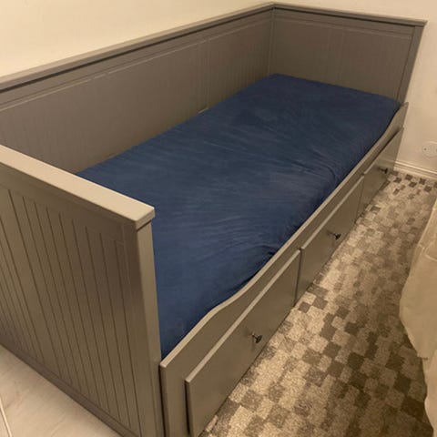 IKEA HEMNES seng med oppbevaring i hvit farge. Sengen har tre skuffer under for ekstra oppbevaringsplass. Laget av tremateriale. Følger ikke med madrass.