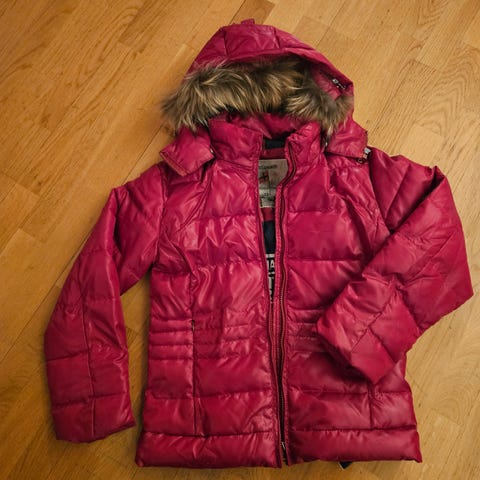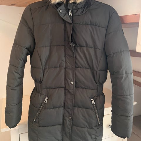 Fin svart ytterjakke for barn. Det er ingen hull eller slitasje. Kan være det er slitasje eller ser mer brukt ved pelsen til hetten