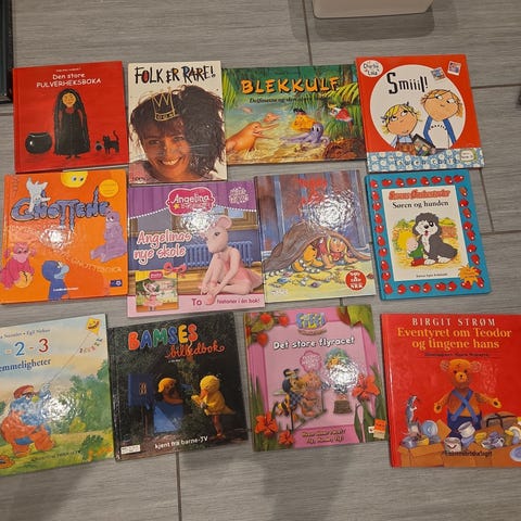 Pakke med diverse barnebøker, hovedsakelig bildebøker og høytlesningsbøker. Bøkene har ulike temaer og illustrasjoner, og passer for barn i barnehage- og småskolealder. Innholdet spenner fra eventyr og fantasihistorier til hverdagsfortellinger og klassiske barnebøker. Flere av bøkene har fargerike omslag og illustrasjoner som egner seg godt til høytlesning og egenlesning for barn som har begynt å lese selv.
